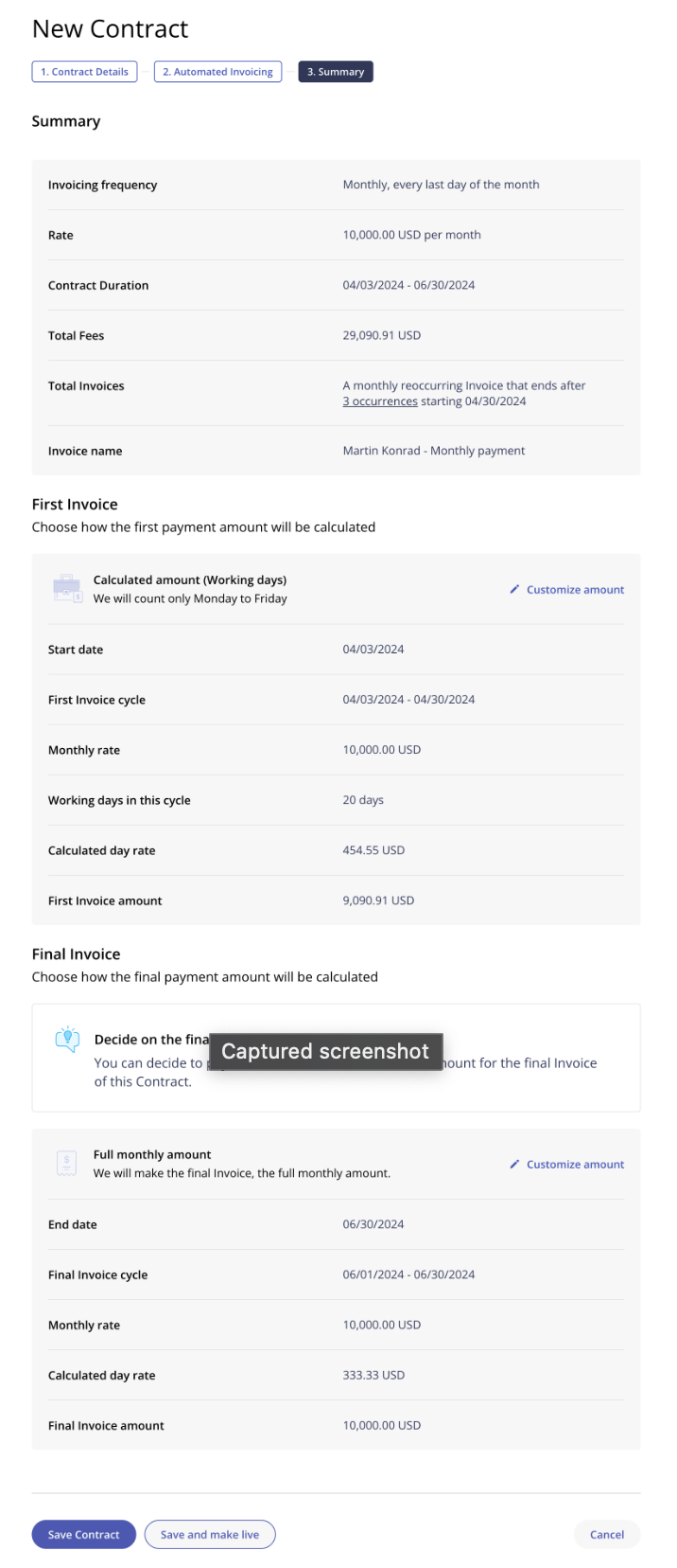- 3-step form: Contract Details, Automated Invoicing, Summary.